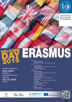 Manifestazione "Erasmus Welcome Day 2015", lunedì 26 ottobre, con inizio alle ore 12,00, viale delle Scienze, edificio 7, Scuola Politecnica, sala Capitò.